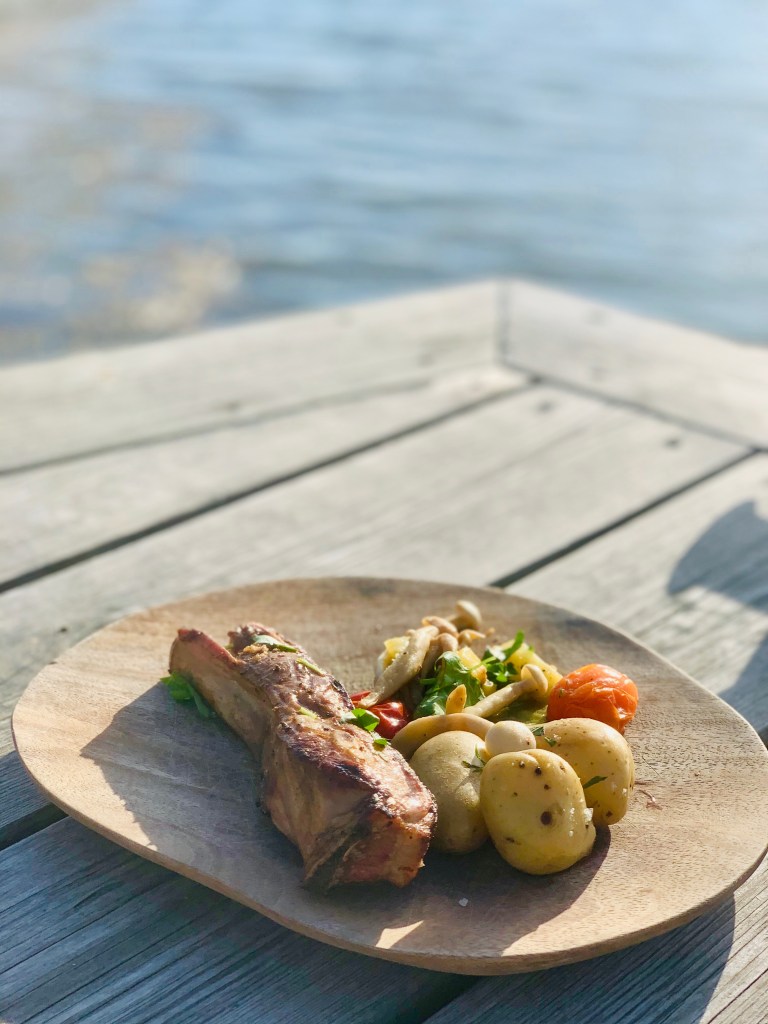 Vi ble helt euforiske da vi fant sider av lammeribbe i butikken for litt siden (frysedisken på Rema 1000), og bare måtte drasse dem med oss til sjøs. Det angret vi definitivt ikke på. Jeg snakker ikke om lammecarré her, men om rause, svære ribbestykker med bein, som produsenten hadde vært elskverdig nok til å snitte opp så de var enkle å få fra hverandre.