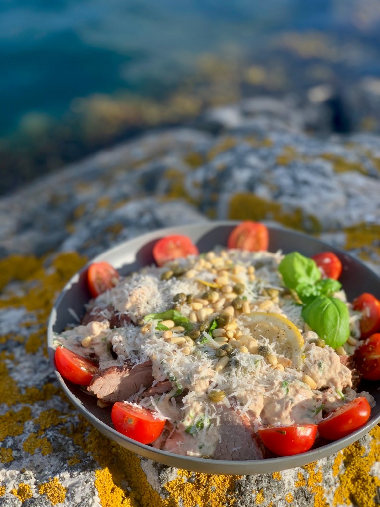 Skjær kalvekjøttet i tynne skiver og ha på serveringsfat med tunfiskrøren på toppen. Ha hakket basilikum, ristede pinjekjerner og revet parmesan på toppen, og server gjerne med cherrytomater og hvorfor ikke et glass kald hvitvin?